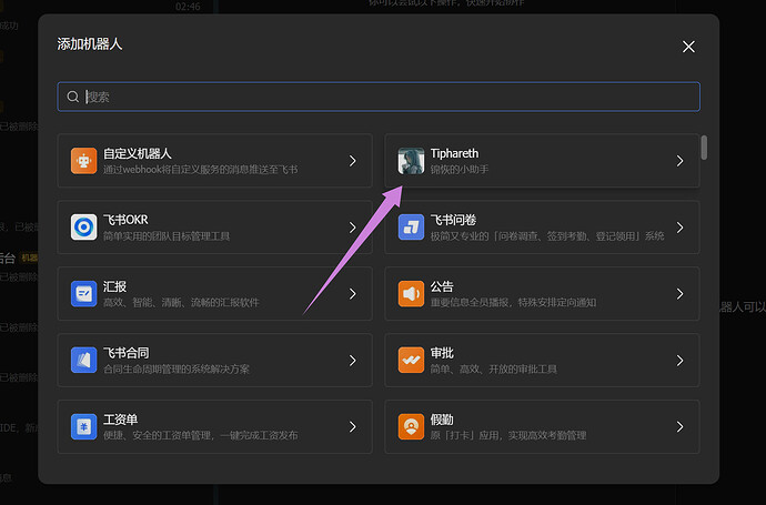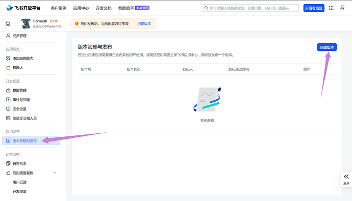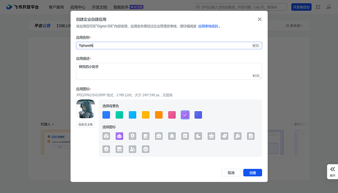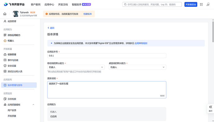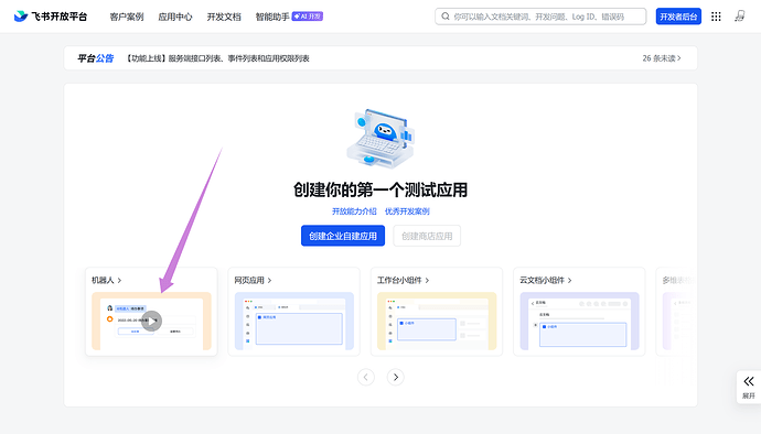 完成上面的一系列操作之后,让你的客户端和浏览器的飞书各个应用都登录你当前的组织和账号,点击 飞书开放平台 进入飞书开发者平台。点击右上角的开发者后台。选择机器人