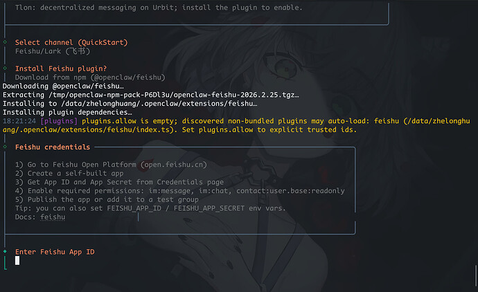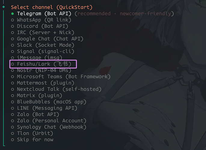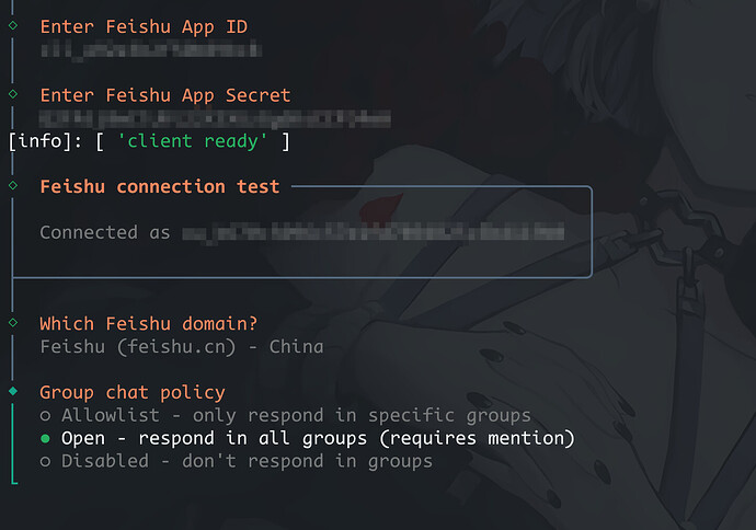 后续分别选择 Feishu (feishu.cn) - China 和 Open - respond in all groups (requires mention)