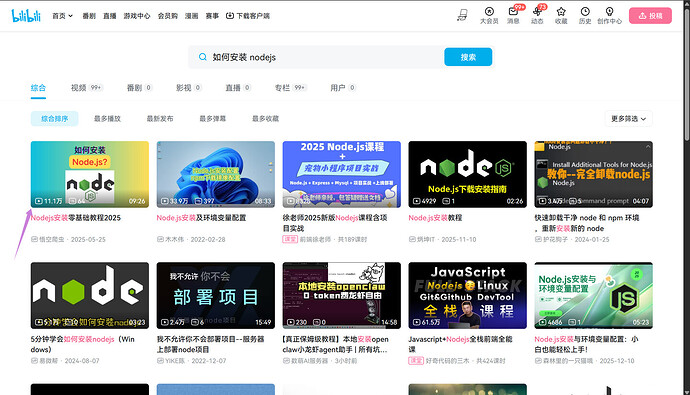 为了让 qwen 这样的AI助手可以运行,我们首先需要安装基础的编程环境nodejs,自己去 B站 上搜【如何安装 NodeJS】即可,你随便找个高赞的点进去安装就完事。注意,我们一定要安装 node22 或者 node24(不要安装别的版本!!!):