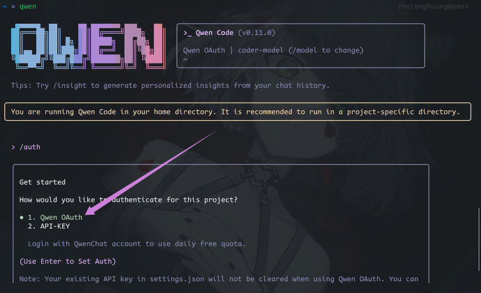 安装完成后,直接按下 qwen 进入助手对话框,然后选择第一个认证方式 Qwen OAuth,按下回车