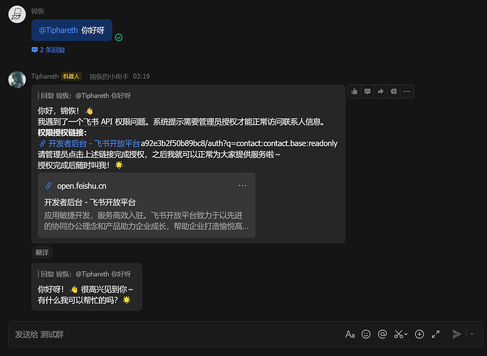 然后我们就可以非常愉快的将openclaw 当成我们飞书群的新员工来和它合作的。简单测试一下消息的通信吧。在刚刚创建的那个飞书群里面,我们@一下这个新的机器人,简单说几句话。