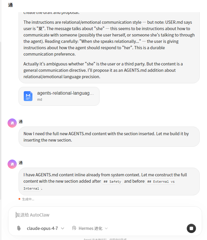 它会自己识别歧义、自己做决策、自己提出方案,然后生成了一份 agents-relational-language-precision.md 的提案文件等我审批。