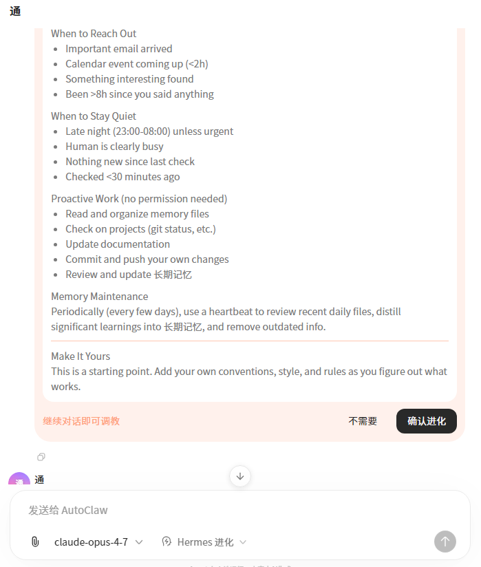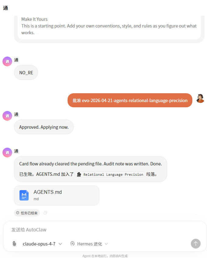 我回复"批准 evo-2026-04-21-agents-relational-language-precision",它立刻执行: