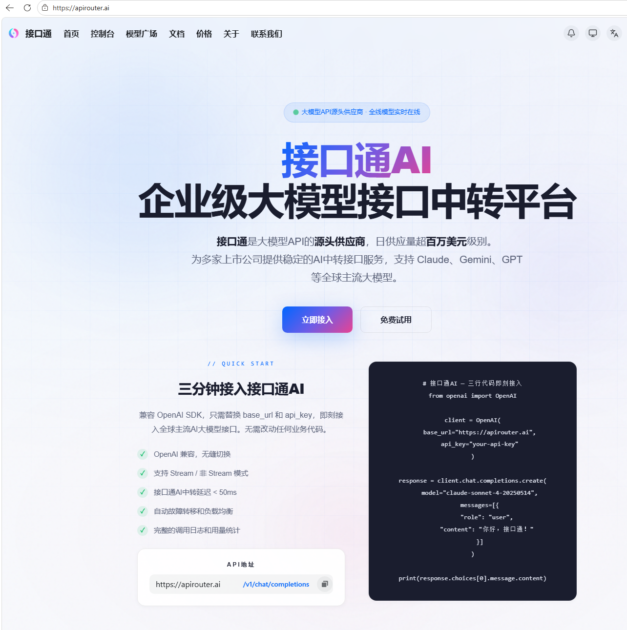 官方路线基本堵死,目前国内稳定可用的方式就是 API 中转站。我用的是 接口通(apirouter),几个月下来没掉过链子,今天就用它演示。