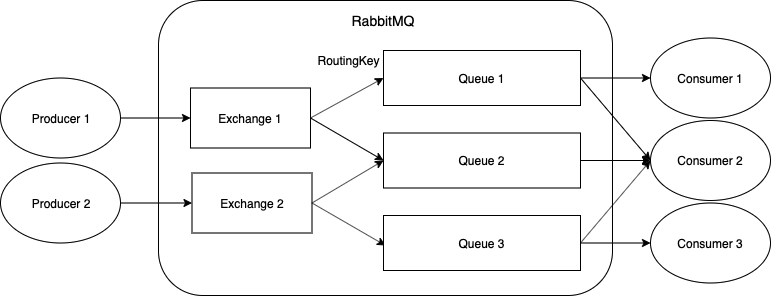 - Exchange 根据 RoutingKey 把消息路由至具体 Queue