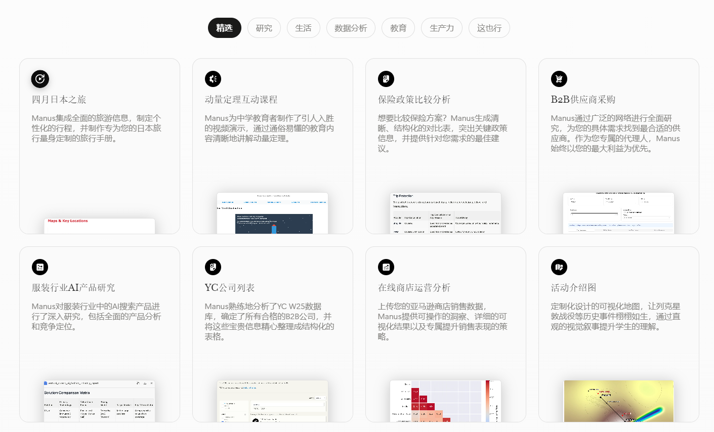Manus 能够独立拆解复杂任务,调用工具并执行操作,最终交付完整成果。以下是其典型应用场景: