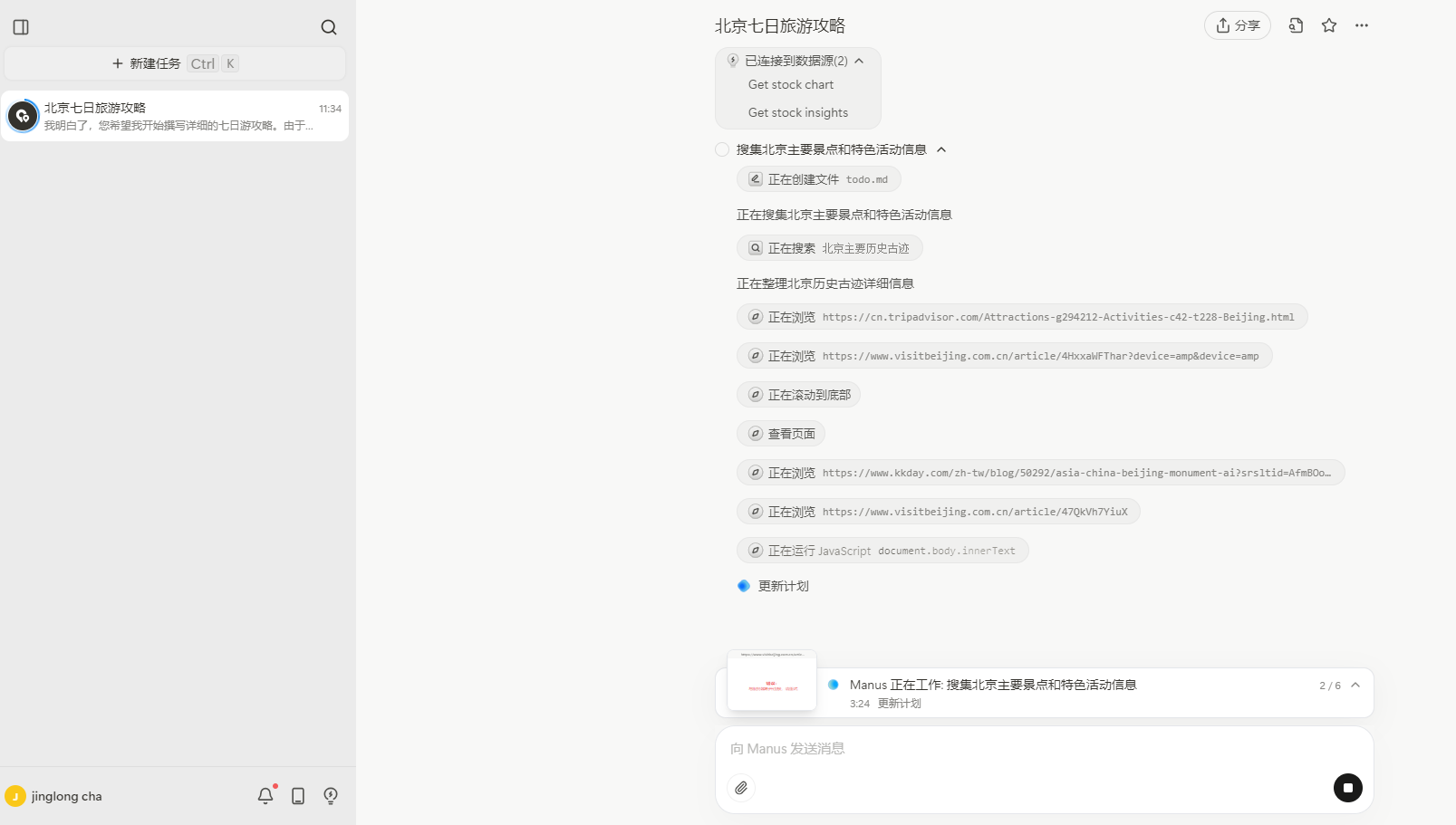 - 旅行规划:输入目的地和时间,Manus 整合交通、住宿、景点信息,生成个性化旅行手册。