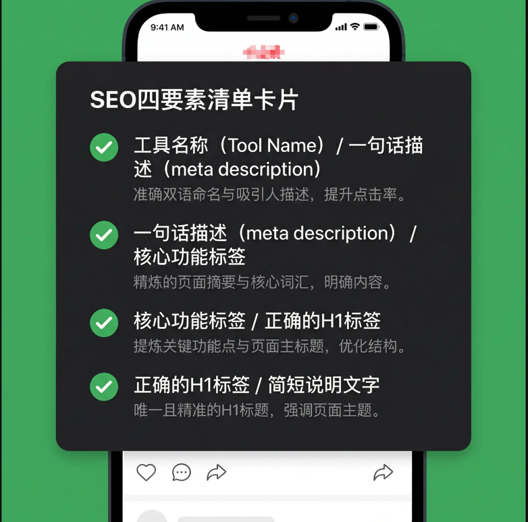 每个工具页面至少要有:工具名称(中英文)、一句话描述、核心功能标签、正确的H1标签。这四件事,Vibe Coding不会主动帮你做。