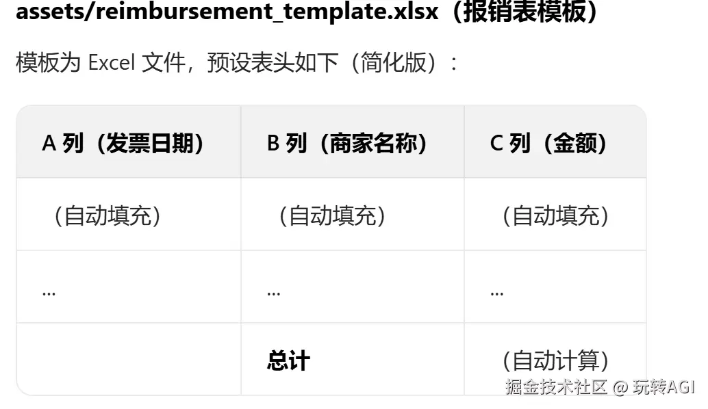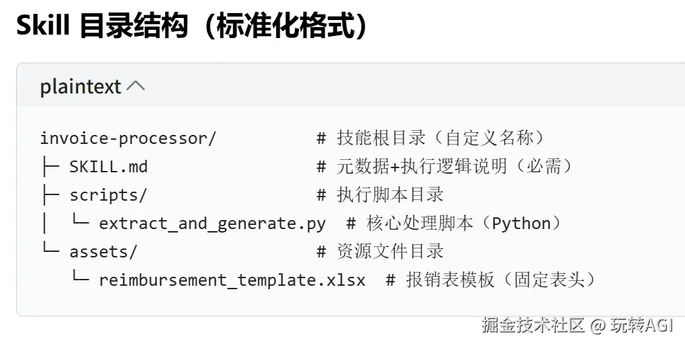 下面以PDF 发票信息提取与报销表格生成实用 Skill 为例,完整展示其目录结构、核心文件内容及使用流程。该 Skill 能自动从 PDF 发票中提取关键信息(金额、日期、商家等),按企业标准格式生成 Excel 报销表,适配财务、行政等高频办公场景。