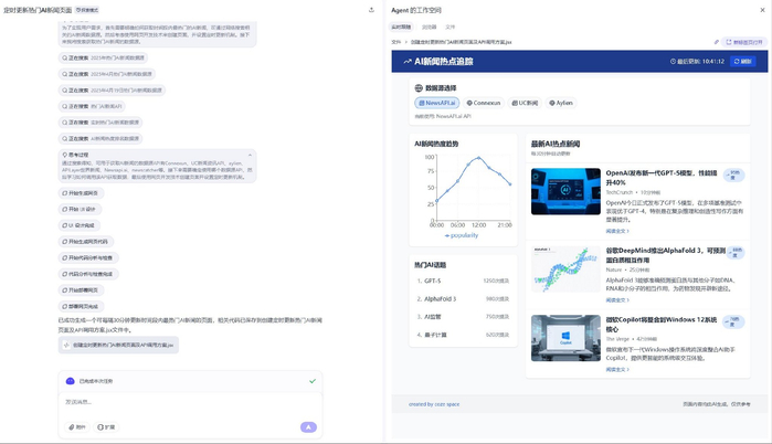 就在昨晚,扣子空间(Coze Space)正式开启内测,它可以根据你的问题自动分析需求、拆解成多个子任务,最终输出网页、PPT 或者飞书文档。