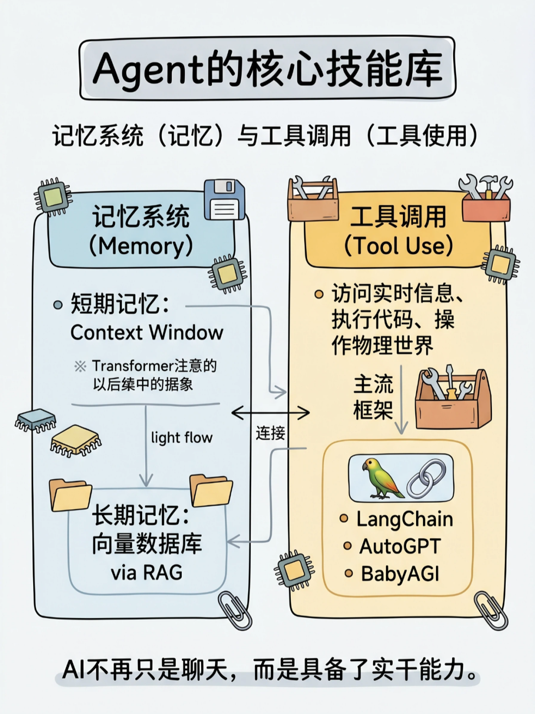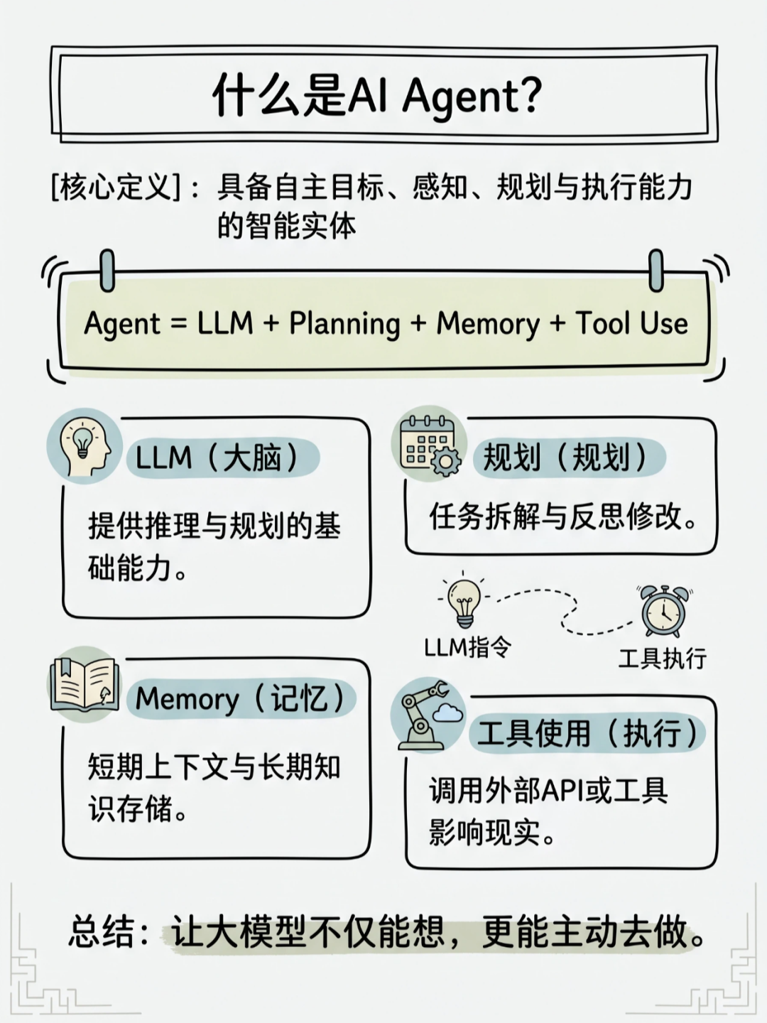 总结一下就是给大模型装上了:感知的眼睛、规划的大脑、执行的手脚和记忆的仓库。让 AI 从 “被动对话” 走向 “主动做事”。