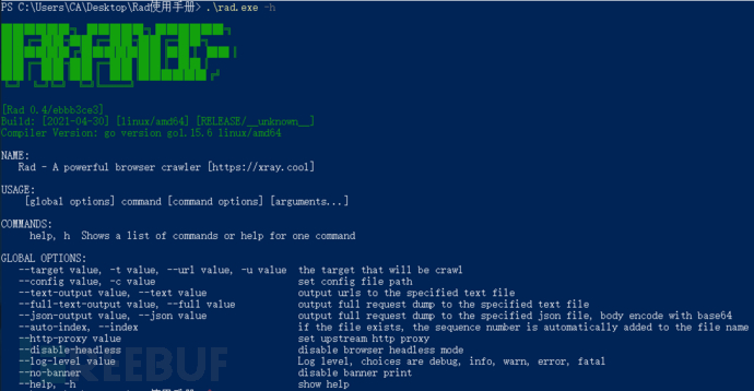 首先使用rad.exe -h查看Rad本身自带的帮助信息