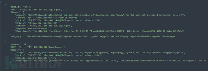 2.上述的使用容易出现POST请求不会被检测到的情况,所以可以使用Json格式进行输出,然后通过脚本实现对GET请求与POST请求的分离,使用多命令执行来实现精准匹配。