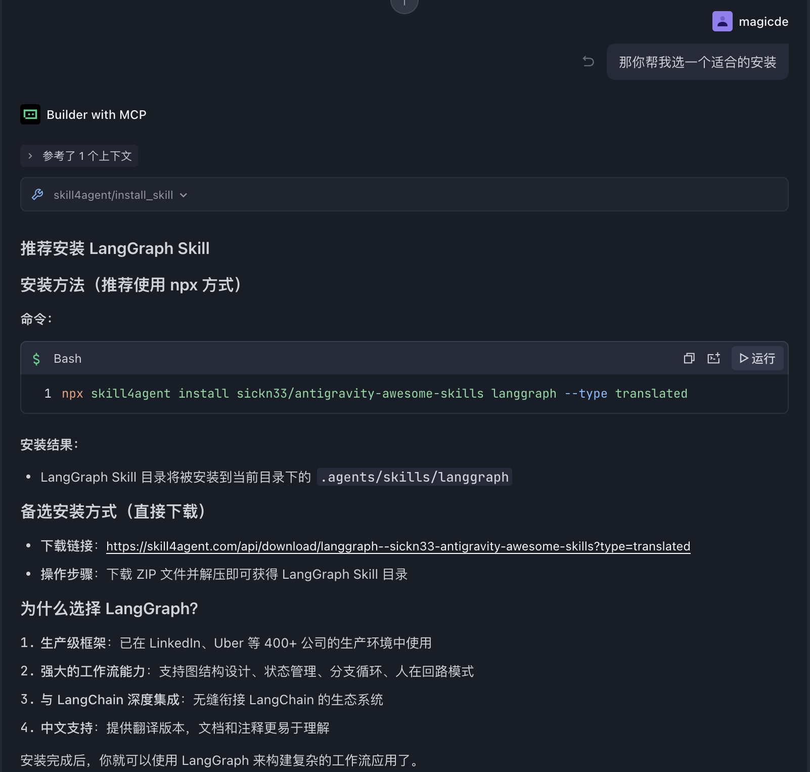 skill4agent还提供了MCP Server,复制以下配置到Trae、Cursor、Claude-code等支持MCP的客户端就可以使用了
