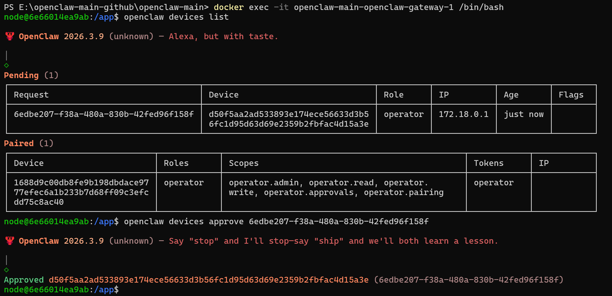 需要进入到容器中处理,执行命令“docker exec -it openclaw-main-openclaw-gateway-1 /bin/bash”进入容器,然后依次执行“openclaw devices list”和“openclaw devices approve