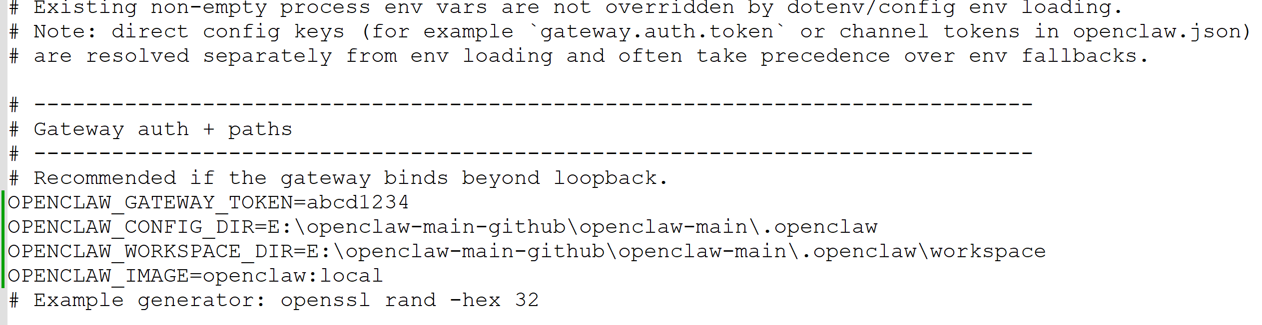 4.修改.env配置,打开项目目录下的.env文件,添加OPENCLAW_GATEWAY_TOKEN,OPENCLAW_CONFIG_DIR、OPENCLAW_WORKSPACE_DIR和OPENCLAW_IMAGE三个配置项。其中OPENCLAW_GATEWAY_TOKEN可以自己设定,OPENCLAW_CONFIG_DIR和OPENCLAW_WORKSPACE_DIR两项配置映射了容器的配置目录和工作目录,也就是说,这两个目录是容器可以访问的目录,后续需要openclaw处理的文件,都放到OPENCLAW_WORKSPACE_DIR配置的目录下即可。OPENCLAW_IMAGE配置为openclaw:local,也就是刚才生成的镜像名。如图所示: