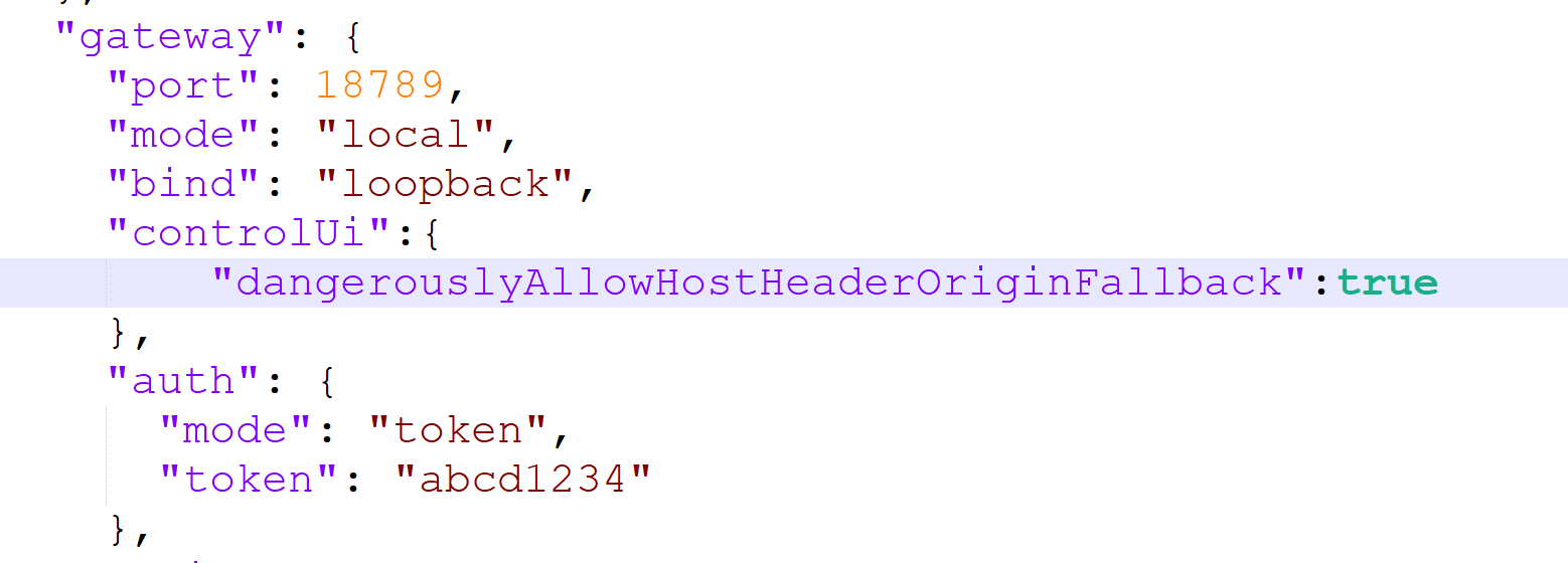 6. 修改openclaw.json,容器启动后,发现容器无法正常运行,需要修改一下配置。打开OPENCLAW_CONFIG_DIR设定目录下的openclaw.json文件,找到gateway配置,添加“controlUi.dangerouslyAllowHostHeaderOriginFallback”的设置,如图所示。