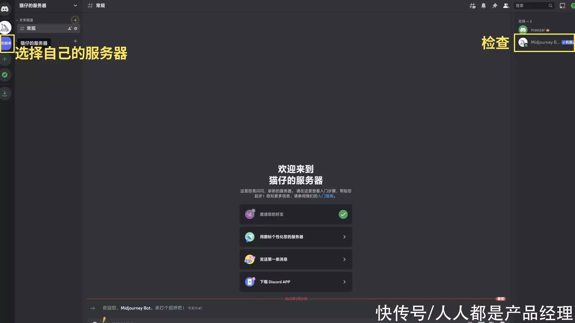 跟着下面图片的步骤,找到Midjourney服务器,很好找,基本都在第一个,点进去就可以了;