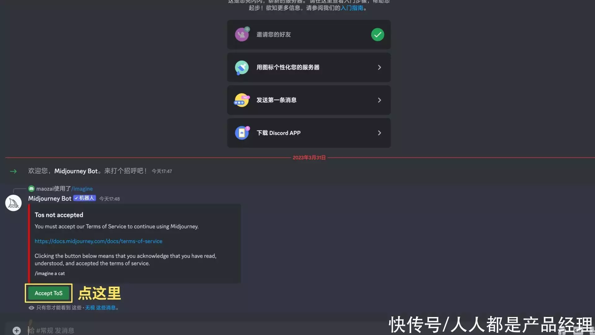检查无误后,用命令 /imagine prompt: 随便输入关键词回车,就会出来接受协议的按钮,选择“Accept ToS”接受协议;