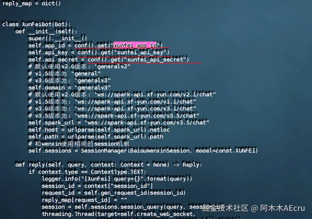 发现讯飞模型会去读取这三个配置,我说怎么错误了,其实一开始也是知道星火请求是需要这三个的,但是不知道配置字段是哪个,然后从这里就发现了,把这三个配置上之后,再重启就好了。
