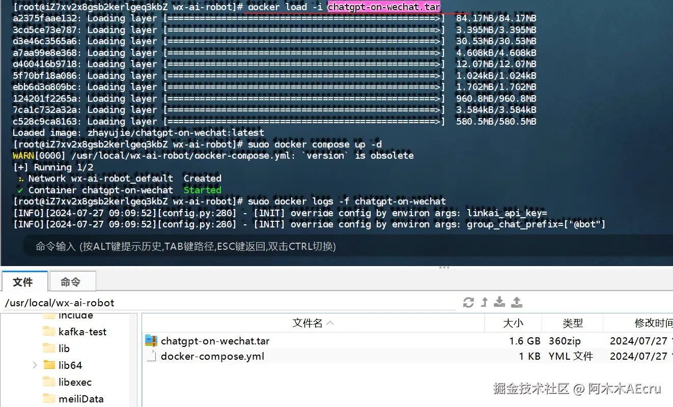 ps:这里需要注意一下,由于镜像可能是在海外站点,所以可能会拉取超时不成功。如果你们也遇到这种情况的话,可以在自己电脑安装DockerDesktop后使用”魔法上网”的方式拉取到本地,打包成tar包后上传服务器或者关注一下公众号”香蕉学java”,回复”微信AI机器人” 即可获取镜像压缩包