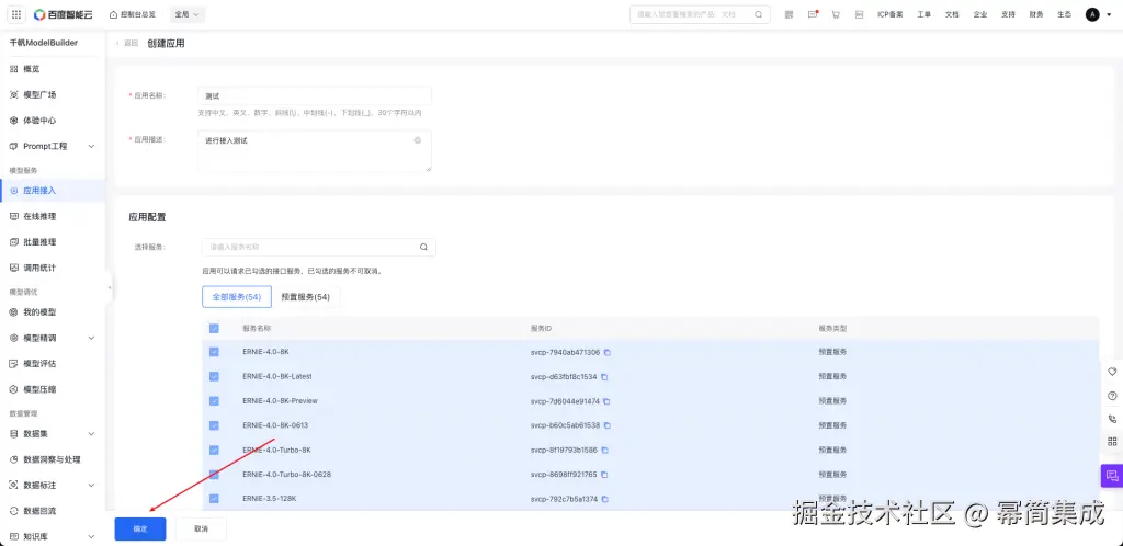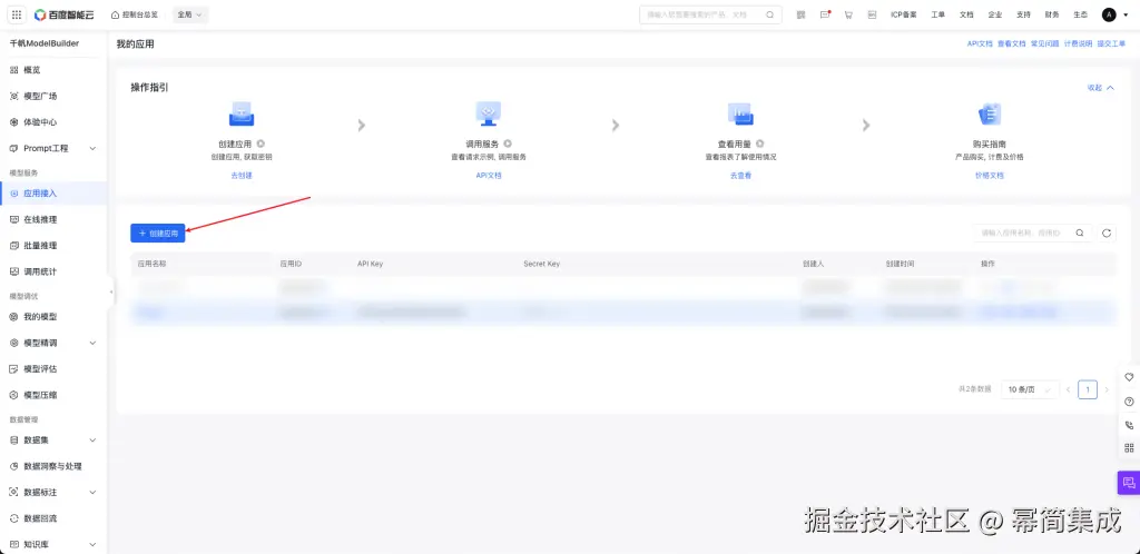 2.进入千帆ModelBuilder点击左侧的应用接入并且点击创建应用