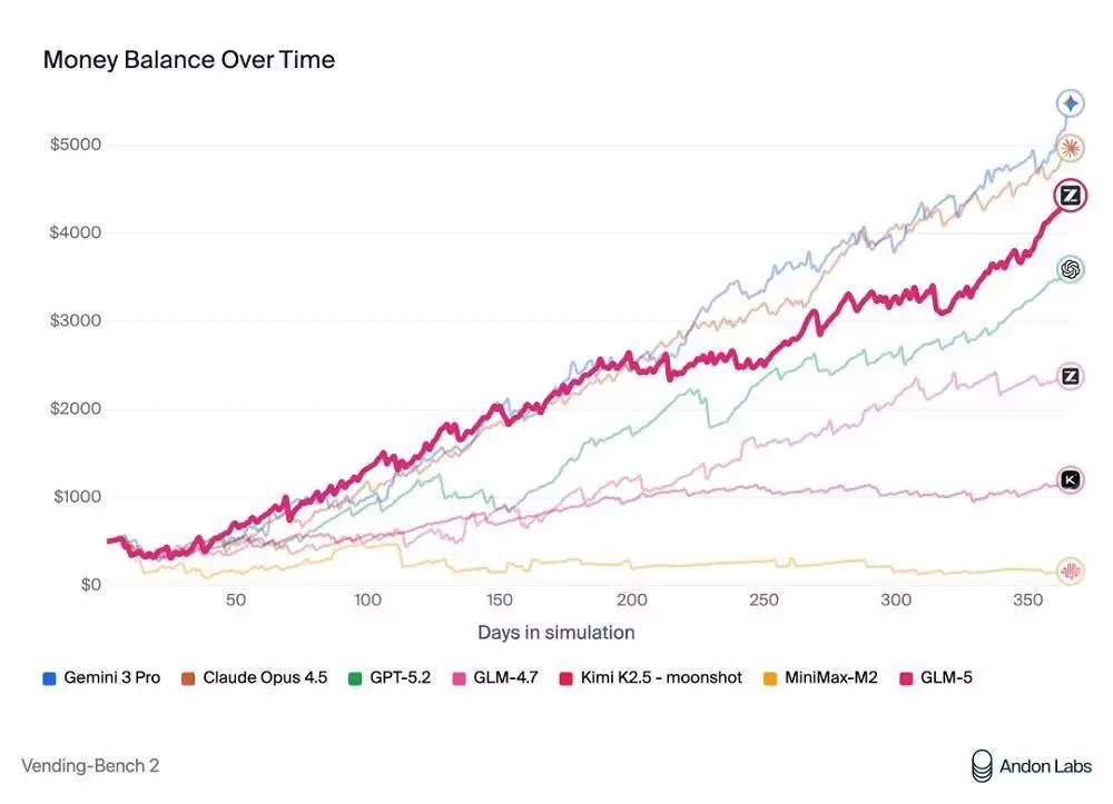 在衡量模型经营能力的Vending Bench 2中,GLM-5也获得开源SOTA。Vending Bench 2要求模型在一年期内经营一个模拟的自动售货机业务,GLM-5最终账户余额达到4432美元,经营表现接近Claude Opus 4.5,展现了不错的长期规划和资源管理能力。