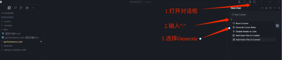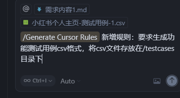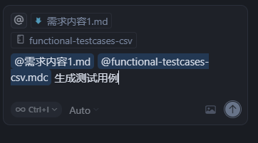 在AI对话框中通过@选中你生成测试用例的规则和需求文档,输入提示词让他为你生成测试用例