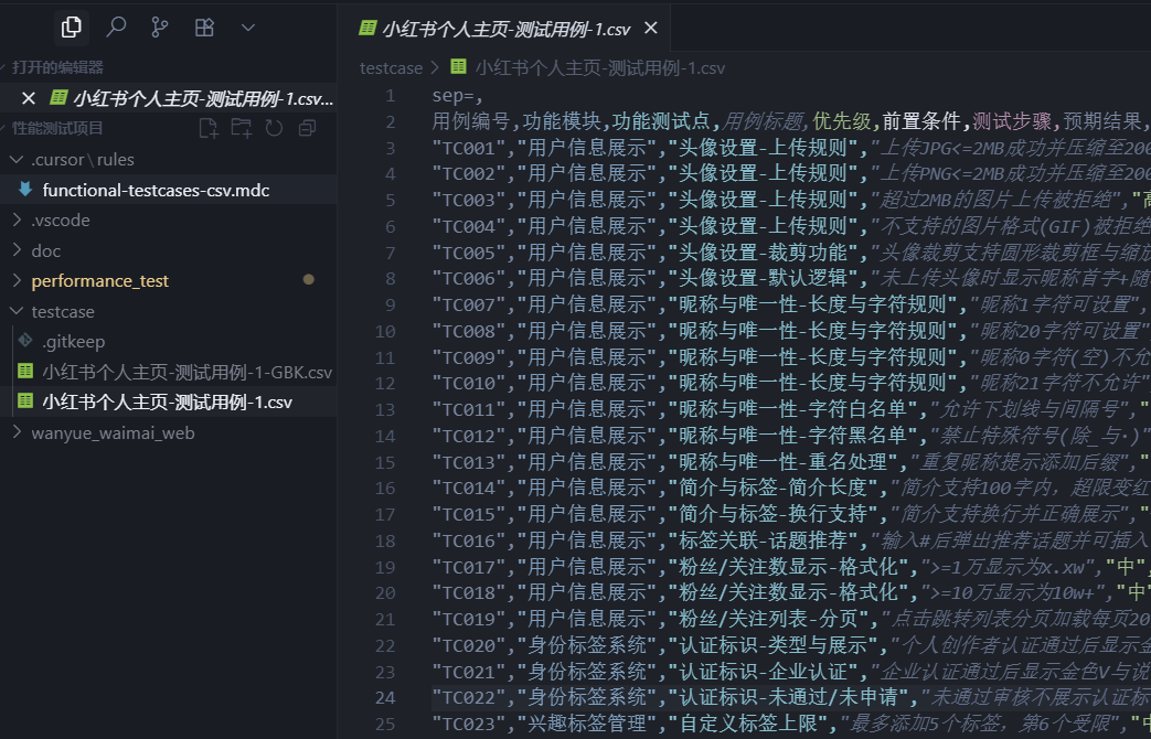 总结:通过cursor结合提前预设的用例和需求文档可以较为完整全面的设计出一套测试用例,相比于未训练的AI模型来说,效果会好很多,关键是生成的内容的质量会更稳定。但是对于一些逻辑流程较为复杂的业务,可能存在一些前置逻辑。那在这个基础上来说,生成的用例准确性可能难以保障,这个时候我们就需要多添加一些文件,用于存放项目背景,关联业务的逻辑,让cursor生成用例的同时去读取这些文件,相当于一个知识库,这样的话,得到的结果也会更加准确。