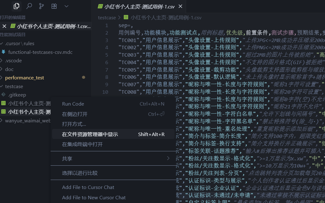 7.选中测试用例文件,鼠标右键点击在文件资源管理器中显示(可读性更强)
