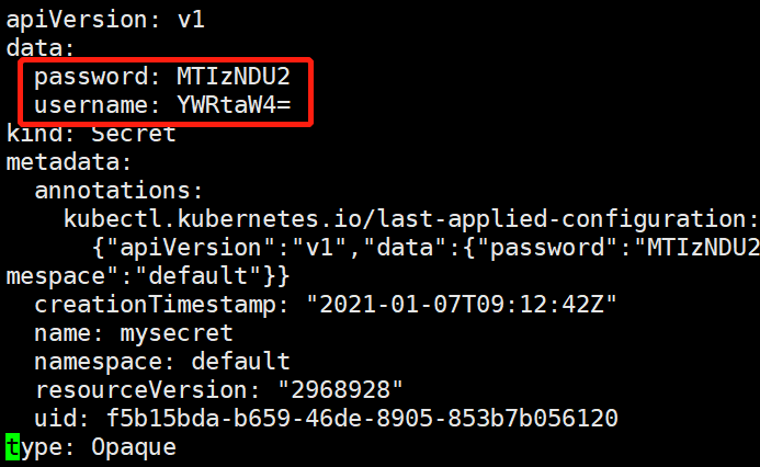 讯享网apiVersion: v1 data: password: MTIzNDU2 username: YWRtaW4= kind: Secret metadata: annotations: kubectl.kubernetes.io/last-applied-configuration: | {"apiVersion":"v1","data":{"password":"MTIzNDU2","username":"YWRtaW4="},"kind":"Secret","metadata":{"annotations":{},"name":"mysecret","namespace":"default"}} creationTimestamp: "2021-01-07T09:12:42Z" name: mysecret namespace: default resourceVersion: "" uid: f5b15bda-b659-46de-8905-853b7b056120 type: Opaque