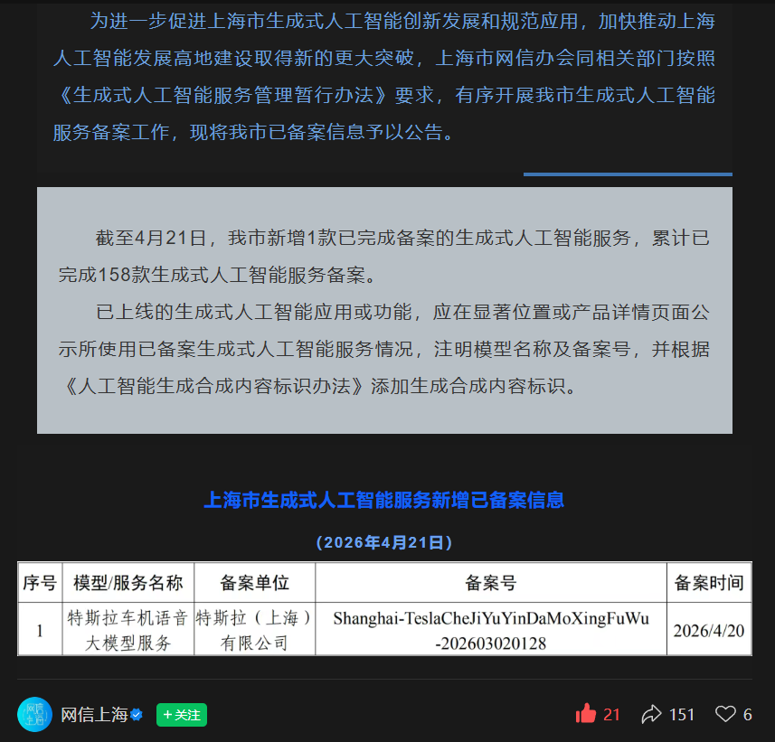 就在今日下午,根据@网信上海官方公众号>>>公布显示,特斯拉中国已于 4 月 20 日提交了