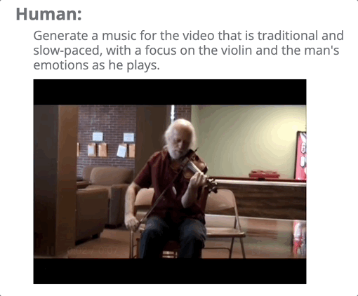 将图像/视频+音乐的注解文本输入到MPT-7B模型,分别得到人类端和模型端对话。