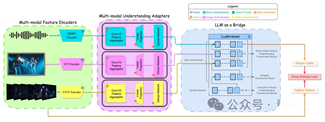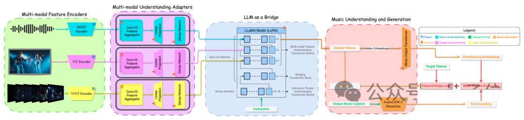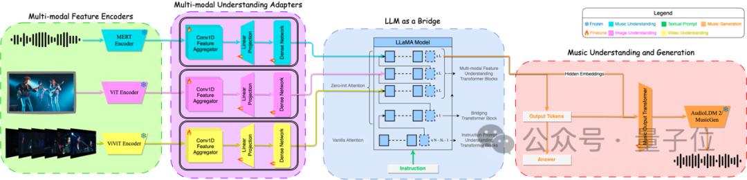 M2UGen模型分为四个模块区域,分别是多模态特征编码器、多模态理解适配器、桥接LLM以及音乐理解与生成模块。