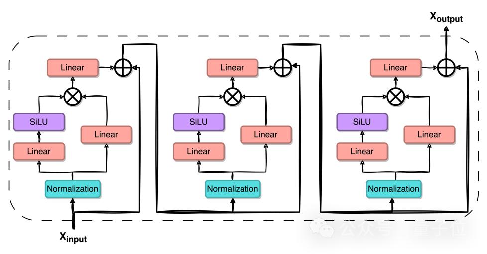 其中Xi表示第i个子模块之后的输出嵌入向量,Lj,i表示第i个子模块的第j层线性层,Ni表示第i个子模块内的正则化层,SiLU是激活函数。
