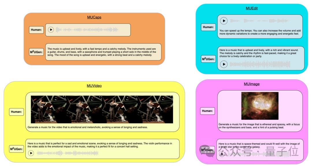 此外,由于没有很多合适数据集用于模型训练,研究团队还研发了一套数据生成方法,制作了MUCaps、MUEdit、MUImage、MUVideo四个数据集并发布。 目前团队已将模型代码库在Github开源,并在Huggingface上开放了模型权重和训练所需数据集(需申请)。