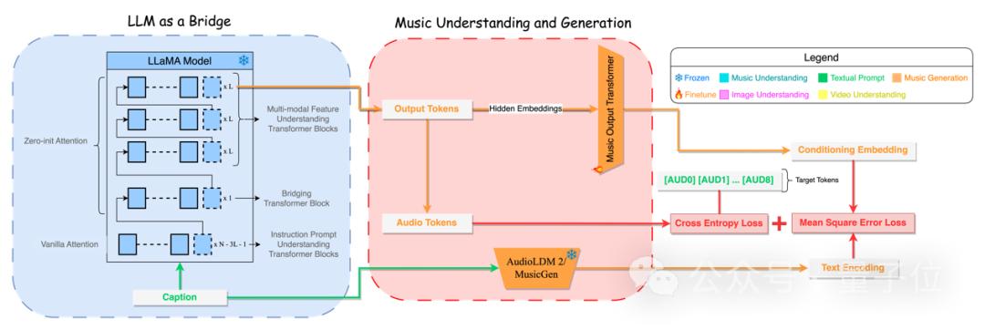在模型训练阶段,对于以音乐作为输出(即音乐生成任务)的训练样本对(如文本指令-音乐对),这些音频标记会添加在LLM输出的末尾,用于指示下游的音乐输出。