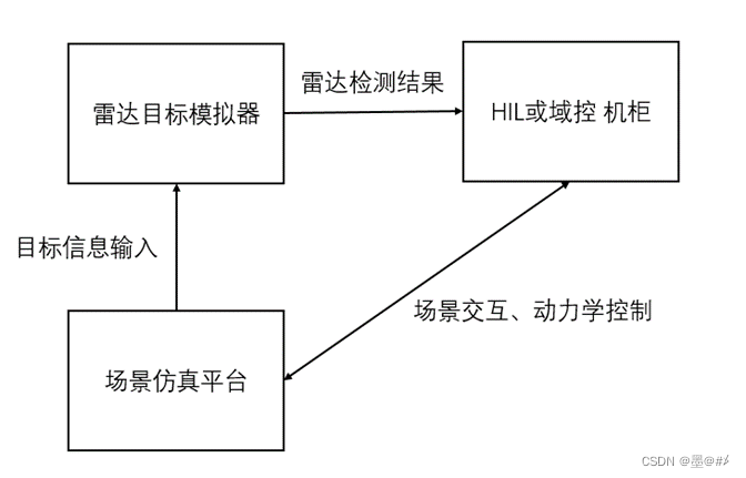 在2.1节中提到,雷达目标模拟器的参数设置可以来自上位机的交互界面、也可以来自其它仪器设备。单纯的测量雷达的目标检测性能参数是该仪器的一个重要应用场合。还有一些更高级点的应用:当我们基于雷达的检测结果去做ADAS域控测试时,也可以用到该设备,一种MIL(模型在环)的测试架构如下: