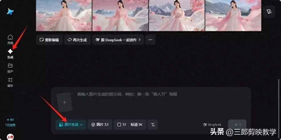 步骤一,打开即梦,单击左侧的【生成】,然后切换到【图片生成】,如下图所示;