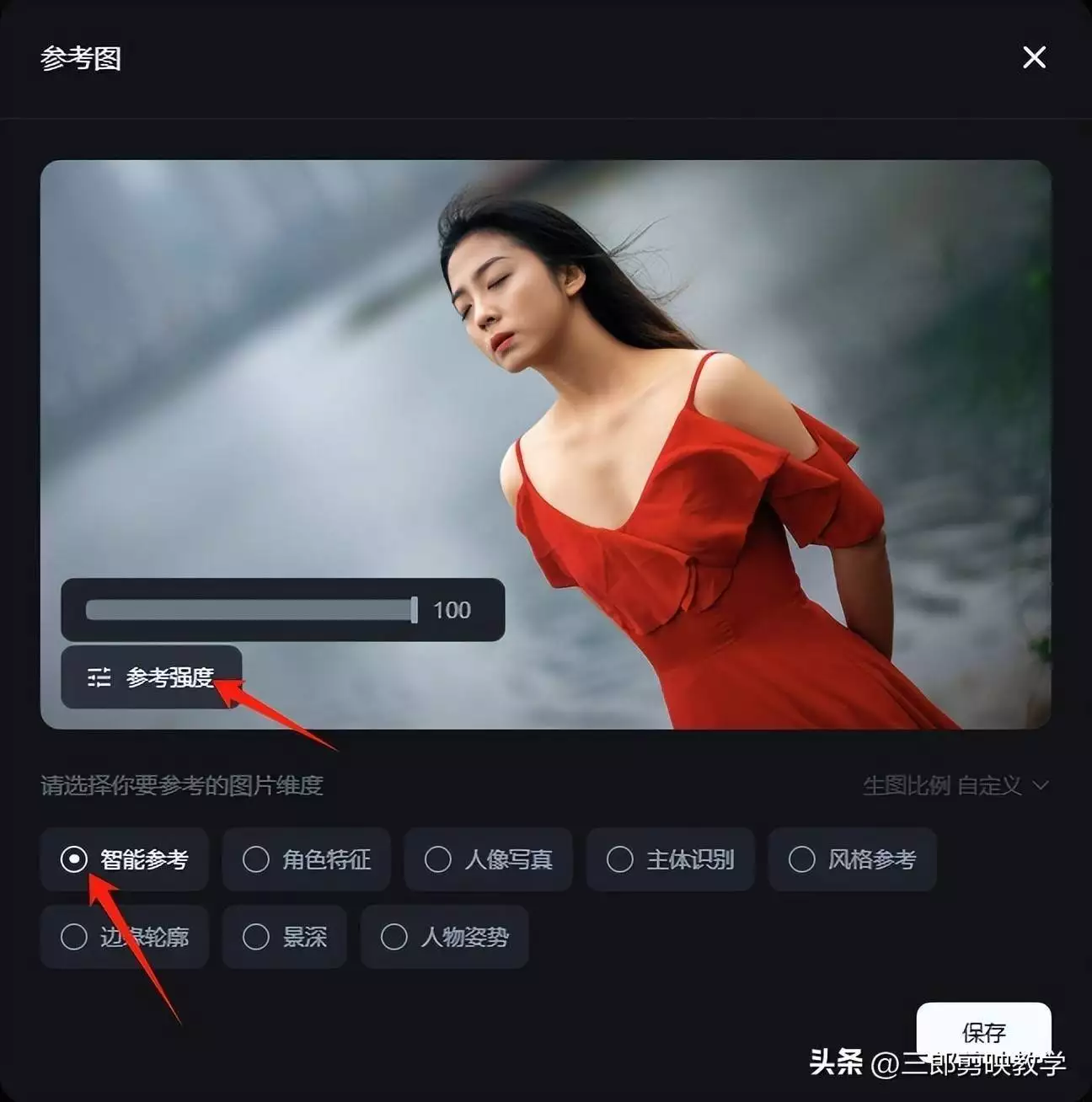 步骤二,上传要更换背景的图片,参考图界面勾选【智能参考】,【参考强度】调整成100,接着单击右下角的【保存】,如下图所示;