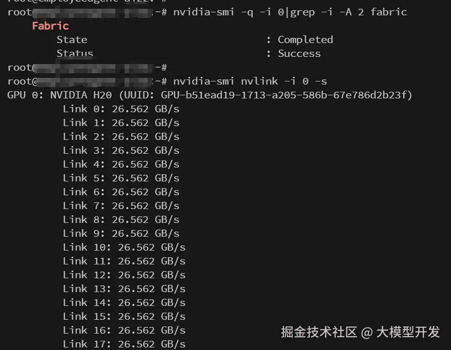 本次使用的NVlink版本的H20 GPU,所以需要安装nvidia fabricmanager来启用多GPU之间的NVLink通信,否则GPU将不能正常使用。