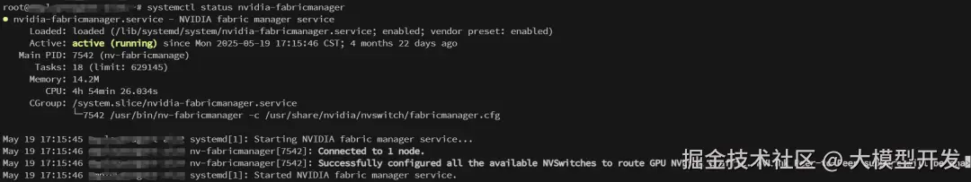 检查nvidia-fabricmanager服务状态是active: