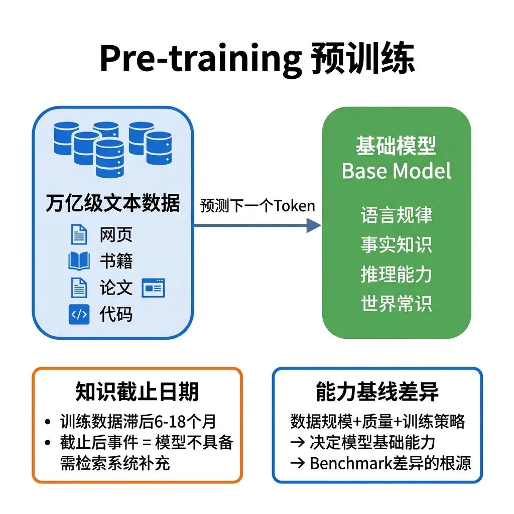 不同厂商在预训练数据规模、质量和训练策略上的差异,决定了模型的基础能力水平。这是不同模型在Benchmark上表现差异的根本原因,不是单纯的参数量差异。