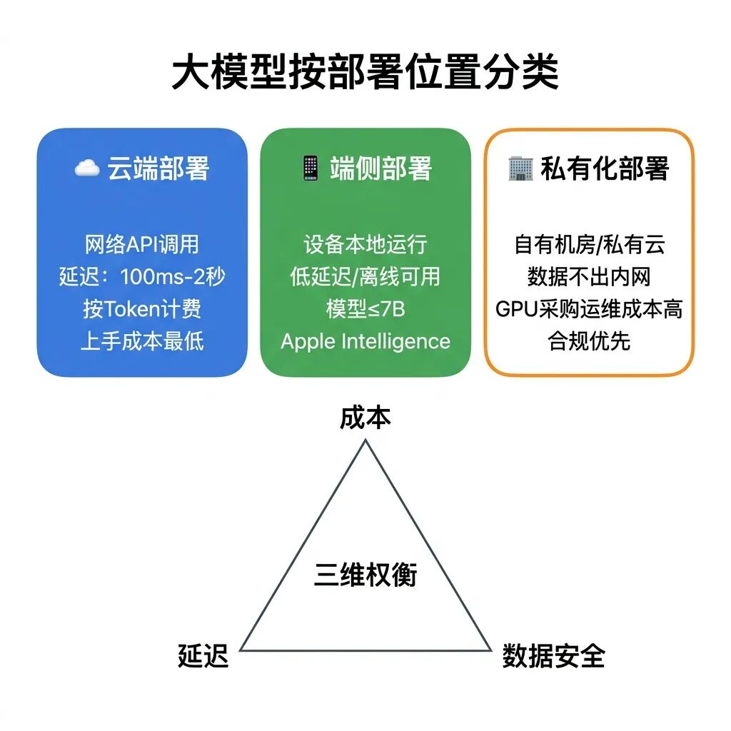 端侧部署 是模型运行在用户的设备上,比如手机芯片、PC的NPU。数据不通过网络传输,延迟低,无网络也能运行。受设备算力限制,能运行的模型参数量通常在7B以下。苹果的Apple Intelligence、手机厂商的端侧AI功能均属此类。