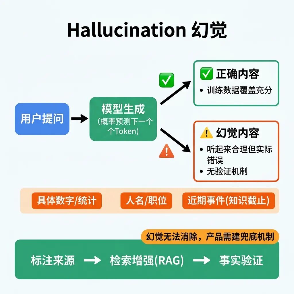 Hallucination 是模型生成听起来合理但实际上错误或虚构内容的现象。这不是模型的诚信问题,是模型生成机制的固有特性。模型的生成过程是基于统计概率预测下一个Token,没有验证机制核查生成内容是否符合事实。