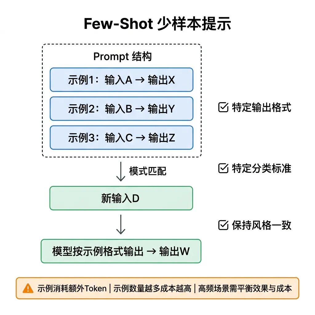 Few-Shot会消耗额外的输入Token。示例内容越长、示例数量越多,Token消耗越高。高频调用场景下需要在效果和成本之间找平衡点,通常2到3个示例是性价比最高的数量。
