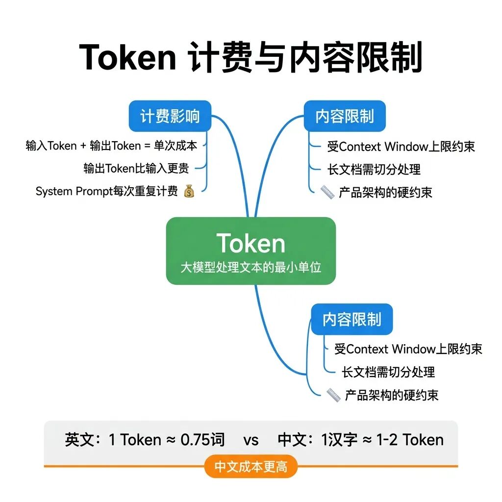 Token 是大模型处理文本的最小单位,不等于字或词。英文中,一个Token平均对应约0.75个单词。中文中,一个汉字通常对应1到2个Token,具体取决于分词器。处理同样信息密度的文本,中文消耗的Token数量高于英文,成本更高,这个差异在高频调用场景下累积效果显著。