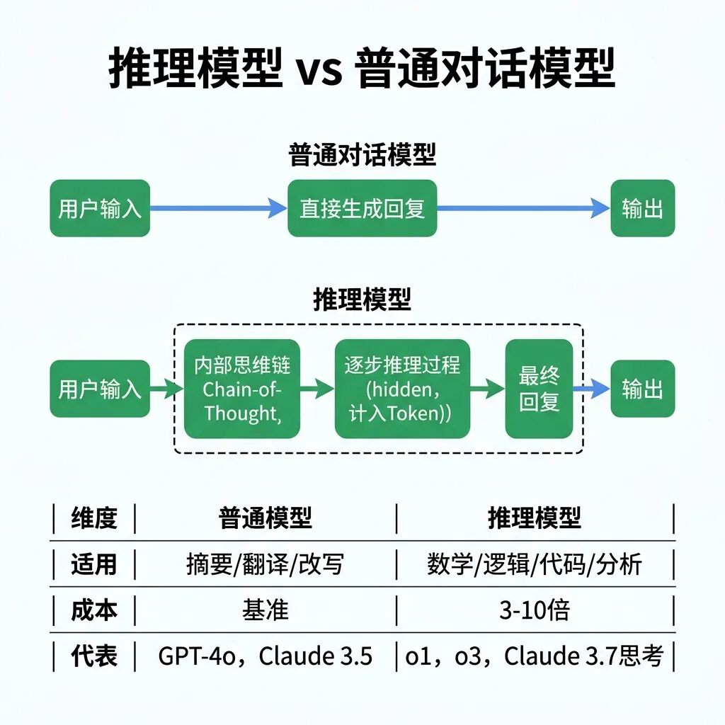 同样一个复杂分析任务,普通对话模型经常漏掉关键逻辑,推理模型的准确率明显更高,但API账单也跟着翻了好几倍。
