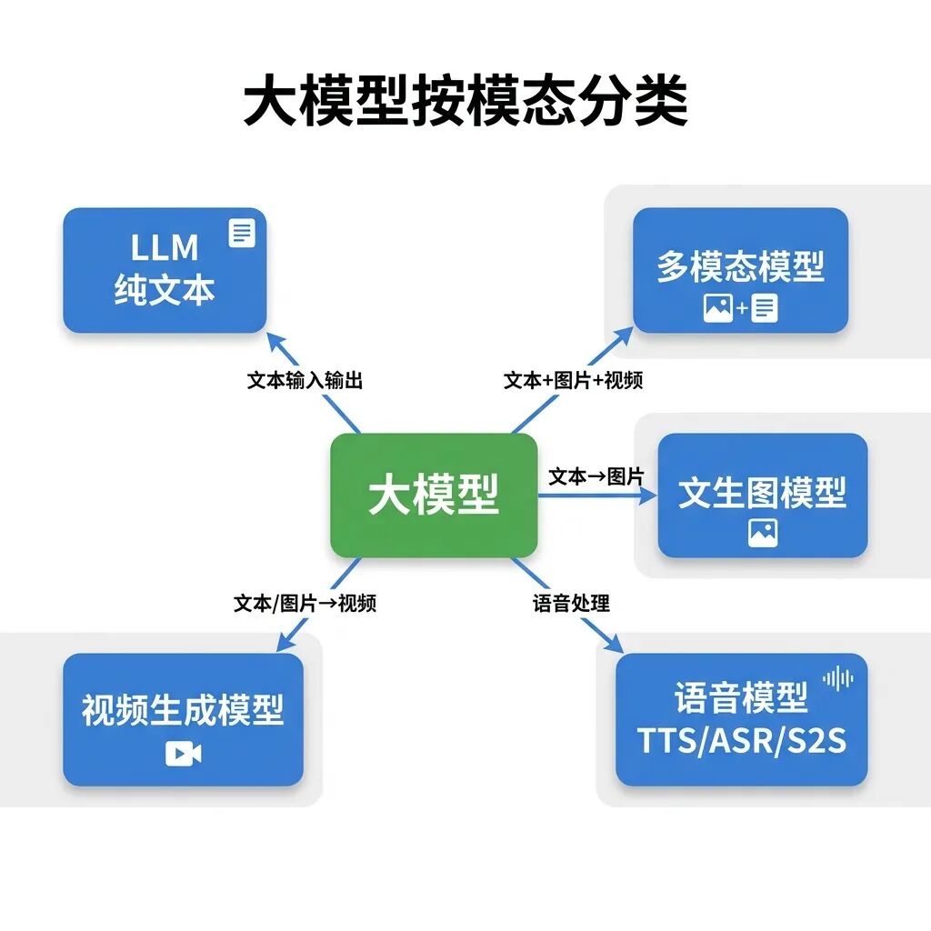 大模型处理的信息类型被称为 模态。不同模态对应不同类型的模型,这是产品选型的起点。
