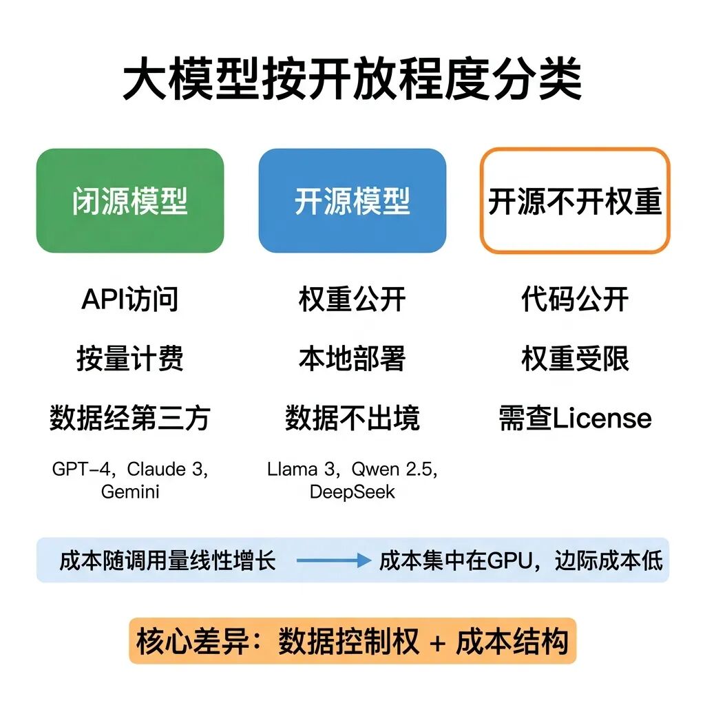 还有一种中间态叫开源不开权重,代码和架构公开,但模型权重受商业许可约束,不能自由商用。选型时需要仔细阅读license文件,不能只看GitHub上的开源标签。